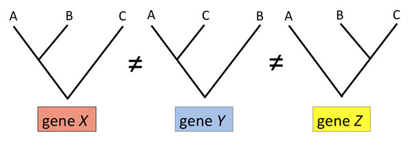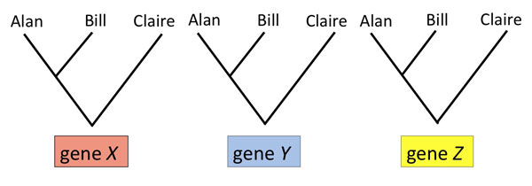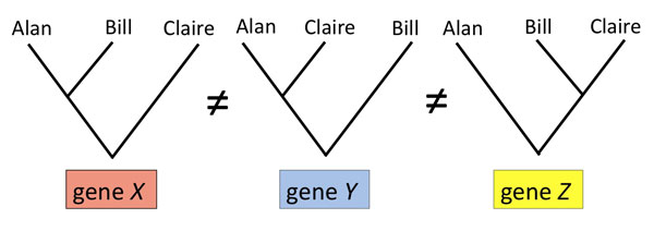 ここでは遺伝子Xはある1つの歴史を作り出し、遺伝子YとZはそれに矛盾する歴史を作り出している(アンイコールで示されている)。この枝分かれパターンのうちの、ただ1つだけが真実であることができる。(現実にはすべてが間違いということもあるが、1つが真実であれば、他は間違いでなければならない。)再び、理解のための類比としてアランとビルとクレアを考えてみよう――